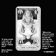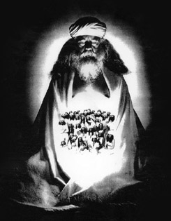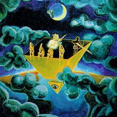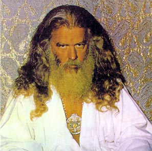 The related singles are not worth to trace musically. It contains some garage rock from Sky Saxon, but "There's nothing from his most Yod-like solo release, "Lover's Cosmic Voyage"." B.Coley All singles were released under the names of "World Peace Band", "Sky Saxon Sunflower Dragon Slayers" with "the Bangles Vicky and Debbie", or with "The Lamed",or by "Hale Sunlight Wings White Magick + Being Poor", or by "the Universal Stars Band" (CD released as related singles, CTCD-141) Unreleased materials was released as disc 13 from Captain Trip Records, CTCD-142, all by Fire, Water and Air, "largely mainstream rockoid material... plus a Saxon rap about being nice to dogs.*" * idiot hippie talk in fact. Quite OK is an earlier Yahowa track without the master from "Penetration". Tr.9, "Sky Sunlight Saxon speaking to the Earth Aquarian Family" 5 min This track, from the most loyal follower, telling about the music which I played, is a good track to end with, giving a perpsective overview but shows also how much respect as well as naivity Yahowa left behind. All quoted parts from Byron Coley, came from an article with review of the 13 CD box of Yahowa 13, which first appeared in The Wire magazine issue 180 February 1999. These quotes are reproduced by permission. Link to The Wire magazine : www.thewire.co.uk. An interview with Yahowa members can be found at http://www.furious.com/perfect/yahowa13.html Unreleased albums will come out soon at http://www.coda-records.com/news.html I started a page with some filosophical remarks about some concepts related with Yahowa : "As above, so below, New Order of the Ages", the number 13 in a group, the oncept of the guru, and the principle of "I am God", which I will later review better at a page about Salvador Dali's opera "Être Dieu". (I lost the original study of it before because of a virus computer crash, so I might need some time to reconstruct this). These remarks are published in a seperate Yahowa's concepts - remarks page Thank you J.W. for borrowing the full collection box. Another tribal psychedelic music sage like figure is Wulf Zendik Another curiosum sage like figure is Moondog Later the tribal commune group Cromagnon will have a seperate page too. Go back to the Main index |
