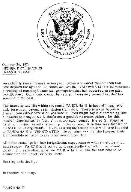 YAHOWA : THE STORY, THE RADIOPROGRAM, CHRONICALLY WITH DISCOGRAPHY "In 1969 To Baker, a middle aged follower of the Yogi Bhajan a Kundalini yoga master and health food prophet who came to the US on the heels of the Maharashi. When Bhajan declared that he was not God, Baker assumed the mantle himself. He gathered a group of acolytes who became known as The Source and opened a health food restaurant, The Aware Inn, in Hollywood's Laurel Canyon. Eventually dubbed Father Yod (later changed to Yahowa), Baker espoused a philosophy dictating kindness to animals, a rw fruit and vegetable diet, wearing the white cotton clothes, and sex without orgasm. Apocryphal stories about The Source's practices abound. The most persistent was based on the similarity of the spelling between god and dog. Among the faithful who toiled at the Aware Inn were a number of musicians, whose talents Yod enlisted when the tapes began spooling." Byron Coley (from review in the Wire : see note at the end) DISCOGRAPHY : 1. Father Yod and the Spirit of '76 : Kohoutek Higher Key Records 3301 / 1973 Yahowa collection disc 1 Captain Trip CTCD-130 *** A little bit "incredible strange" or over the top of odd singing vocals, not always with the best voice in an improvisational manner (piano, electric guitar, el. bass, voice, backing female vocals). Liner notes : "Kohoutek is an energy. Scientists estimate that its radiance will excel Haley's Comet 50 times, its head to be 100,000 miles in diameter, and its tail to span 100,000,000 miles in space. It will not appear again they say for another 80,000 years. Man in his history and myth has long associated the comet with the ominous power of the unknown. He has learned that they bring changes. Life after their fiery visitation is never quite the same. What is Kohoutek ? Why is it coming ? What will it bring ? The mystery of "K houtek" is explored in spontaneous music, sound and song on Higher Key Record's first release by Father Yod and The Spirit of '76'. Don't stay in the dark Kohoutek is for you." PS. The text of "I am God, I am the Father of All" (click cover to see it readable), according to the aditional liner notes came "from the Father of All Words to his son Yahowa God of this sphere who is here, now." Tr.1, 737-1455 Tr.2, 120-720 2. Father Yod and the Spirit of '76 : Contraction Higher Key Records 3302 / 1974 Yahowa collection disc 2 Captain Trip CTCD-131 *** Somewhat low key psych with nice flute, el. Guitar, improvisation, voice, gospel like female vocals, drums, el.piano and organ. Side 2 is great. ( The 13 members on the album : Octavius Aquarian, drums and percussion, Pythias Aquarian, bass, Cinderella Aquarian, vocal, Zinuru Aquarian, recording centre, Vibration Aquarian, electric organ, Rhythm Aquarian, concert grand piano and electric piano, Zoraster Aquarian, lead rhythm, Anastasia Aquarian, vocal, Damian Aquarian, recording engineer, Aquariana Aquarian, vocal, Djin Aquarian, rhythm lead, Mother Ahom Aquarian, vocal, Sunflower Aquarian, bass) Tr.1, 800-1330 Tr.2, 1200 |